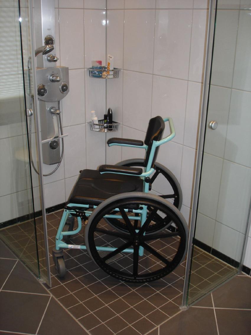 Für Rollstuhlfahrer ist die Bewegungsfreiheit sehr wichtig. So muss die Höhe von Waschtisch und Toilette auf den Rollstuhlfahrer individuell angepasst werden; ebenso die Tiefe vor- bzw. unter dem Waschtisch (unterfahrbar). Im Duschbereich muss eine 360 Grad Drehung mit dem Rollstuhl ermöglicht werden. Duscharmaturen und Ablagen müssen vom Rollstuhlfahrer erreichbar sein.